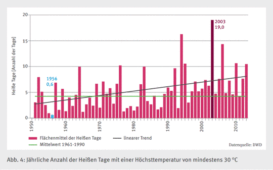 Erklärungstext dazu: Die Graphik zeigt einen kontinuierlichen Anstieg der Tage mit Höchsttemperaturen von mindestens 30 °C zwischen 1950 und 2013. Die Jahre mit den meisten heißen Tagen sind 2006 mit ca. 13 heißen Tagen, 1994 mit ca. 17 heißen Tagen und als Spitze bis 2013 das Jahr 2003 mit 19 heißen Tagen. Seit 1951 ist die Anzahl der heißen Tage im Flächenmittel von Deutschland statistisch gesichert von drei Tagen pro Jahr auf derzeit 8 Tage pro Jahr deutlich gestiegen.