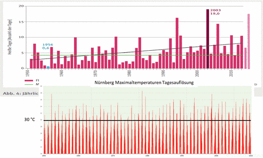 Bild 15 Anzahl Heißer Tage aus [6] (Deutschland) und Tages-Maximalwerte von Nürnberg (DWD Datensatz, Stand 11.2015) mit gleichen Jahreszeiträumen (mit Ergänzungen durch den Autor)