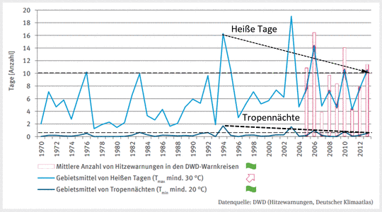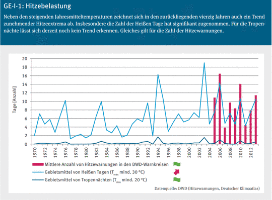 Erklärungstext dazu: Die Hitzewarnungen des Deutschen Wetterdienstes, die seit 2005 ausgesprochen werden, zeigen deutliche Korrelationen mit der Entwicklung der heißen Tage.