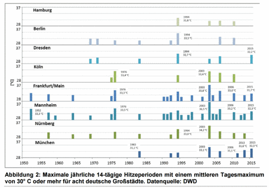 Jedoch ist bei genauerem Hinsehen auch im Süden in den letzten 20 Jahren kein bleibender negativer Einfluss erkennbar, schon gar nicht eine stetige Steigerung. Und bis auf München war sogar im Hitzejahr 2015 der Stand unter dem vor 20 Jahren. Anhand des Bild-Ausschnittes erkennt man, dass der Erklärungstext zu Bild 19 so beschreibt, als würden Hitzeperioden im Süden ansteigen. Er geht nicht darauf ein, dass diese nur kurz gestiegen sind und aktuell wieder auf das normale Maß mindestens der letzten 20 Jahre zurückgehen.