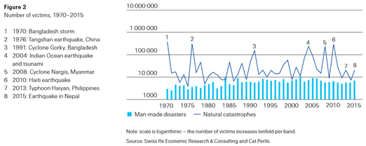 Bild 5 [19] Swiss Re Vergleich Opfer von Naturereignissen und vom Menschen verursachten von 1970 – 2015