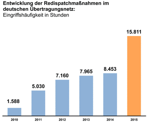 Gegenüber dem Jahr 2014 hat sich die Redispatchgesamtmenge im Jahr 2015 damit mehr als verdreifacht. Diese Entwicklung schlägt sich ebenfalls in den Kosten nieder. Durch eine erste Abschätzung der ÜNB wurden die Kosten der Redispatchanforderungen (ohne Countertrading) auf rund 402,5 Mio. Euro taxiert. Im Jahr 2014 betrugen die Kosten noch rund 185,4 Mio. Euro. Redispatchmaßnahmen wurden in allen Regelzonen, insbesondere aber von TenneT und 50Hertz, ergriffen.