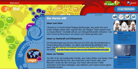 Da ja bekannt ist, dass Kinderbuch(!)autoren für das Umweltbundesamt über den „Klimawandel“ schreiben, ist nicht auszuschliessen, dass auch Dagmer Dehmer den Text über die AfD bei „ZDF.tivi“ mitverfasst hat.