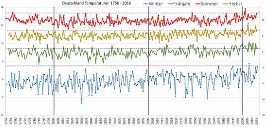 Bild 1 Temperaturverlauf der Jahreszeiten Deutschland von 1750 – 2015/16 (Jahresauflösung). Hinweis: Herbsttemperatur rechte Y-Achse. Grafik vom Autor anhand der DWD-Daten erstellt