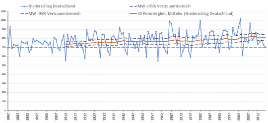Bild 2 Niederschlag Deutschland von 1882 – 2015 (Jahresauflösung). Grafik vom Autor anhand der DWD-Daten erstellt