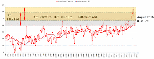 Bild 3 Temperaturanomalien Welt 1990 – August 2016, anhand der Daten vom Autor erstellt. Quelle NASA GISS Land and Ocean Datensatz