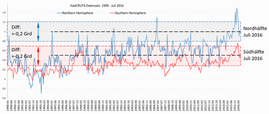 Bild 4 Temperaturanomalien Welt 1990 – Juli 2016, aufgeteilt in Nord- und Südhemisphäre, anhand der Daten vom Autor erstellt. Quelle HadCRUT4 Datensatz