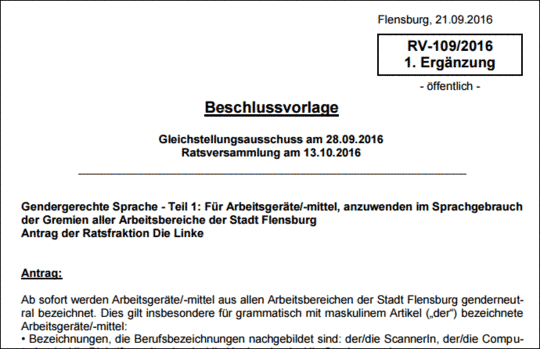 Die Linke RV-109/2016 1: [1] Gendergerechte Sprache – Teil 1: Für Arbeitsgeräte/-mittel, anzuwenden im Sprachgebrauch der Gremien aller Arbeitsbereiche der Stadt Flensburg. Antrag der Ratsfraktion Die Linke