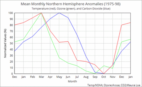 Abbildung 2: Vergleich der mittleren monatlichen Werte von Temperatur (rot), Ozon (grün) und Kohlendioxid (blau) im Zeitraum 1975 bis 1998.