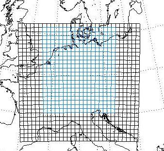 Abb. 1: Klassifikationsgebiet (blau) für die Objektive Wetterlagenklassifikation.