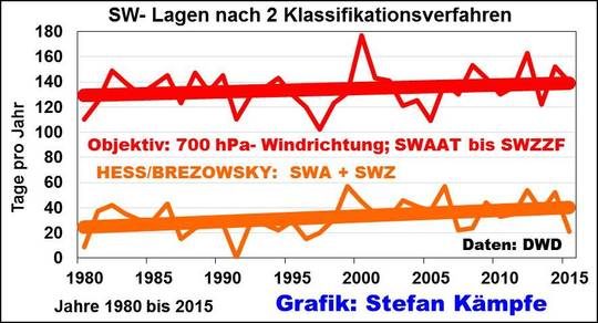 Abb. 3: Merkliche Zunahme der Südwestlagen (Tage absolut je Jahr) sowohl nach dem objektiven Klassifikationsverfahren (oben) als auch nach HESS/BREZOWSKY seit 36 Jahren.