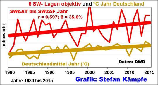 Beide „Südwestlagencluster“ zeigen hinsichtlich ihrer Häufigkeit eine signifikante Korrelation zum DWD- Jahresmittel der Lufttemperatur für Deutschland seit 1980, die nach HESS/BREZOWSKY mit einem Bestimmtheitsmaß B von 14,9% aber recht bescheiden ausfällt. Wesentlich deutlicher ist der Zusammenhang, wenn man nur die 6 erwärmend wirkenden SW- Lagen der Objektiven Klassifikation von SWAAT bis SWZAF betrachtet (die 2 SWZZ- Lagen wirken im Jahresmittel leicht kühlend):