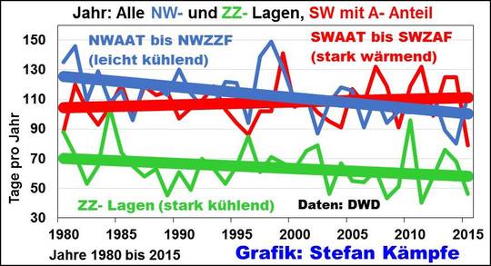 Abb. 5: Im Gegensatz zu den erwärmend wirkenden SW- Lagen nahm die Häufigkeit aller NW- Lagen sowie aller in beiden Höhenniveaus zyklonalen Lagen ab Die starke Häufigkeitsabnahme der NW- Lagen zeigt sich übrigens nach der HESS-BREZOWSKY- Klassifikation seit 1980 nicht; allerdings nahm deren Häufigkeit seit 1881 deutlich ab.