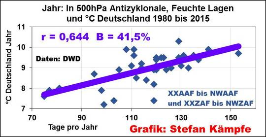 Abb. 7: Die Häufigkeit des Clusters aller mindestens in 500 hPa antizyklonalen (AA und ZA) Lagen, die gleichzeitig feucht sind (insgesamt 10 Wetterlagen), vermag mehr als 40% der Variabilität der Jahresmitteltemperaturen zu erklären; der Korrelationskoeffizient von 0,64 ist hoch signifikant. Ob sich da etwa die „Gegenstrahlung“ des Wasserdampfes stark wärmend bemerkbar macht und dem CO2 den Rang abläuft?