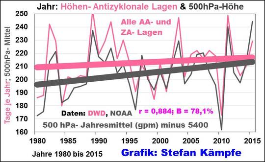Abb. 8: Sehr gute Übereinstimmung zwischen der Häufigkeitsentwicklung aller mindestens in der Höhe (500 hPa) antizyklonalen Lagen (rosa) und der Entwicklung der Höhenlage der 500 hPa- Fläche am Gitterpunkt 50°N, 10°E.