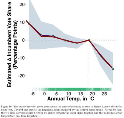Genial und fleißig zugleich – bei Forschern zur Klimawandel-Vulnerabilität natürlich der zu erwartende Normalfall – hat dieser Professor nicht nur wie sonst üblich vor dem Computer gesessen und simuliert, sondern ist (virtuell) zu den Völkern der Welt gegangen und hat deren Wahlverhalten in Abhängigkeit von der Temperatur erkundet, wie eine Zeitung (keine Deutsche war dazu recherchierbar) berichtete: