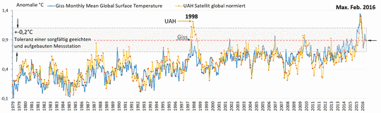 Zur Ansicht anbei die UAH Satellitendaten „lower Troposphere“ (bodennahe Schichten) im Vergleich mit den Giss Stationsmessdaten. Die UAH-Satellitendaten haben zu den Giss-Daten einen Offset. Sie wurden deshalb am Zeitpunkt Januar 1979 mit den Giss-Daten normiert. Trotz der unterschiedlichen Variabilitäten treffen sich beide Temperaturreihen genau im Oktober 2016. Man sieht, dass die Satellitendaten eine höhere Varianz aufweisen und vor allem der El Nino um 1998 bei den Satellitenmessungen zu einem deutlich höheren Temperaturausschlag führte. Damit man ein Gefühl für die Vertikalachse bekommt, ist die Toleranz einer modernen, sorgfältig aufgebauten und geeichten Messstation eingezeichnet. Man denke nicht, Satelliten messen genauer. Deren Sensoren müssen über Erdtemperaturen kalibriert und zudem mit Gewichtungsfaktoren multipliziert werden. Der Vorteil von Satelliten ist lediglich, dass sie (fast) die gesamte Erdoberfläche erfassen – also einen wirklichen Mittelwert bilden können, dafür wird jedoch, je näher zum Erdboden gemessen wird, dessen verfälschende Einflüsse immer stärker.