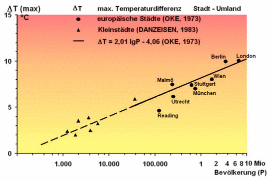 Bild 2 Maximale Temperaturunterschiede in europäischen Städten. Quelle: Ministerium für Wirtschaft, Arbeit und Wohnungsbau Baden-Württemberg: Städtebauliche Klimafibel