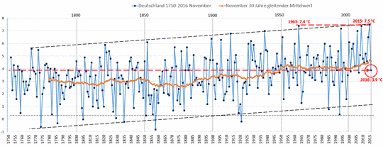 Bild 3 DWD-November-Temperaturen Deutschland seit 1750 – November 2016 (blau), 30-Jahre Mittelwert( braun). Grafik vom Autor aus den Daten erstellt.