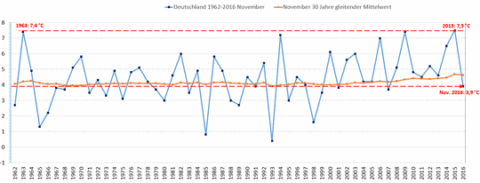 Bild 4 Gezoomte DWD November-Temperaturen Deutschland von 1962 – Nov. 2016 (blau), 30-Jahre Mittelwert( braun). Grafik vom Autor aus den Daten erstellt.