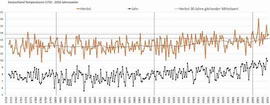 Bild 5 DWD Daten Herbst-Temperaturverlauf (braun), Jahresmittelwert (schwarz) Deutschland 1750 – 2016