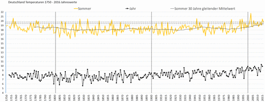 Bild 6 DWD Daten Sommer-Temperaturverlauf (gelb), Jahresmittelwert (schwarz) Deutschland 1750 – 2016