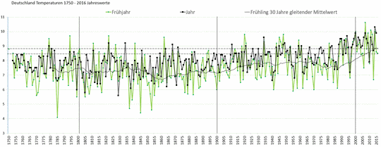 Bild 7 DWD Daten Frühling-Temperaturverlauf (grün), Jahresmittelwert (schwarz) Deutschland 1750 – 2016