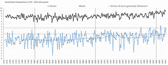 Bild 8 DWD Daten Winter-Temperaturverlauf (gelb), Jahresmittelwert (schwarz) Deutschland 1750 – 2015/16