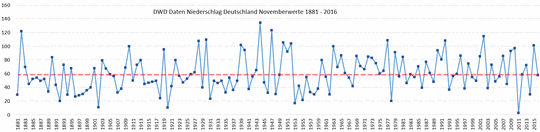 Bild 10 DWD-Niederschlags-Daten Deutschland Novemberwerte 1881 – November 2016. Grafik vom Autor aus den Daten erstellt.