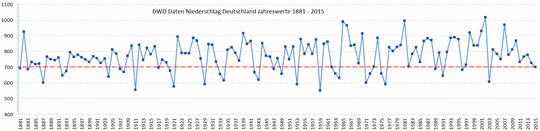 Bild 11 DWD-Niederschlags-Daten Deutschland Jahreswerte 1881 – 2015. Grafik vom Autor aus den Daten erstellt.