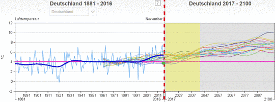 Bild 12 Lufttemperatur-Daten Deutschland Novemberwerte 1881 – November 2016, mit Simulationsläufen zum Jahr 2100. Darstellung aus dem DWD Deutschen Klimaatlas, Emissionsszenario A1B