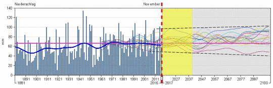 Bild 13 Niederschlags-Daten Deutschland Novemberwerte 1881 – November 2016, mit Simulationsläufen zum Jahr 2100. Darstellung aus dem DWD Deutschen Klimaatlas, , Emissionsszenario A1B. Die Begrenzungslinien sind vom Autor zugefügt