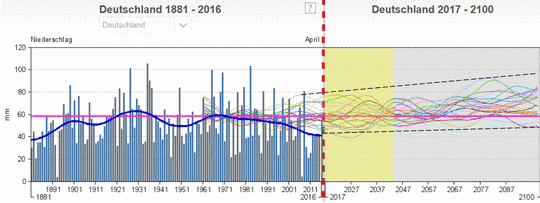 Es scheint niemanden zu stören, dass die meisten Simulationsläufe schon aktuell erheblich vom Mittelwert abweichen (dazu wurde der April-Niederschlagswert als herausragendes Beispiel zugefügt). Alleine aufgrund der heuristischen Betrachtung der Simulationsergebnisse verliert der Autor das Vertrauen in diese Simulationen.