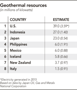 Das Klischee, dass Japan arm an Ressourcen ist, nicht ganz richtig; Es hat weltweit die drittgrößten Geothermischen „Reservoirs“. Um dieses Potential optimal auszuschöpfen, hat die Regierung im Jahr 2012 die Regulierungen gelockert, um den Bau von geothermischen Kraftwerken zu erleichtern.