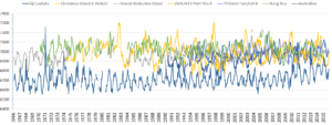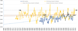 Man kann ziemlich sicher sein, dass bei größerer Zeitlänge der Daten von Fidschi deren Regression schwächer ausfallen würde. Und es stellt sich die Frage, warum Kiribati – dessen Pegel den Wert vom Jahr 1977 ausweist – wie bei Klimaretter.Info gemeldet, stärker vom Pegelanstieg bedroht sein soll als Fidschi.