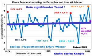Der 2015er, frühlingshafte Dezember mit ersten Frühblühern wurde oft als Vorbote der „Klimaerwärmung“ gedeutet. Doch sehr milde Dezember gab es auch vor mehr als 40 Jahren schon, beispielsweise 1974. Betrachtet man den Temperaturverlauf seit jenem Dezember in Erfurt-Weimar (offizielle Station des Deutschen Wetterdienstes DWD), so erlebt man eine Überraschung: