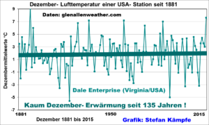 Den geringen (nicht signifikanten) Temperaturanstieg erkennt man kaum, und das, obwohl der 2015er Dezember deutlich wärmer als der 1974er ausfiel. Zumindest im letzten Monat des Jahres fand also der „CO2- bedingte Klimawandel“ bislang nicht statt, denn die Erfurter Werte sind nicht wärmeinselbereinigt (am Flughafen Erfurt- Weimar nahmen Verkehr und bebaute Flächen seit den 1970er Jahren zu, was zumindest leicht erwärmend wirkte und vermutlich neben einer geringfügigen Zunahme der Tage mit Südwestlagen und einer erhöhten Sonnenscheindauer um etwa 17 Stunden seit 1974 die Ursache der Mini- Dezember- Erwärmung ist). Ein nahezu identisches Bild zeigt sich übrigens in Zentralengland, auch dort blieben die Dezembertemperaturen seit 1974 nahezu unverändert. Nun mögen Kritiker bemängeln, es habe sich aber seit 1881, dem Beginn vertrauenswürdiger Messungen in Deutschland, deutlich erwärmt. Das ist korrekt und soll keinesfalls verschwiegen werden, doch jenseits des Atlantiks finden sich Stationen, welche sich schon seit 1881 so gut wie gar nicht erwärmten; ein Beispiel von der US- Ostküste möge das belegen: