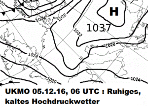 Beim täglichen Blick auf das Barometer fiel der fast stets deutlich zu hohe Luftdruck auf. Wahrscheinlich gab es einen neuen Rekord des Dezember- Luftdruckmittelwertes, was aber erst nach Vorliegen aller Werte endgültig feststehen wird. In Potsdam wurde der bislang höchste Dezembermittelwert 1972 mit 1013,35 hPa (in Barometerhöhe, nicht auf NN reduziert) gemessen. Aber der hohe Luftdruck, der zwischen West-, Mittel- und Südosteuropa pendelte, ging mit fehlender Kaltluftzufuhr, meist schwachem Wind, gebietsweise viel Sonne und zu wenigen Niederschlagstagen einher; trotzdem gab es einige beachtlich kalte Nächte. Die Luftmasse, meist eine im Winter recht milde maritime Subpolarluft (mP), wandelte sich direkt über Mitteleuropa bodennah in gealterte Subpolarluft (xPs oder die trockenere cPs) um, während in der Höhe Warmluftadvektion herrschte, welche den Höhenkeil und das riesige Bodenhoch immer wieder aufbaute. In den klaren, windschwachen Nächten kühlte die Luft bodennah trotz der hohen CO2- Konzentration (im Mittel schon über 400 ppm) und der Höhen- Warmluft stark aus. Zeitweise entstand eine kräftige Inversion (Temperaturumkehr) zwischen dem Thüringer Becken oder dem Werratal (dort sammelte sich die schwere Kaltluft mit teilweise zweistelligen Minusgraden) und den Mittelgebirgsgipfeln mit Temperaturen um 0°C. Die folgende Abbildung zeigt die Wetterlage am Morgen des 05.12.2016: