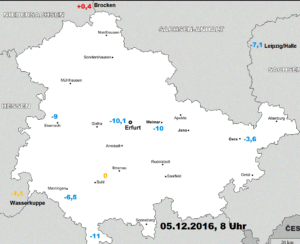 Das umfangreiche, kräftige Hochdruckgebiet über Südosteuropa reichte bis nach Mitteleuropa. Das Luftdruckgefälle und folglich auch der Wind waren über Mitteleuropa nur sehr schwach (großer Abstand der Isobaren). Die nächste Abbildung mit wenigen Temperaturmeldungen in °C illustriert die enormen Temperaturunterschiede über Mitteldeutschland am Morgen des 5. Dezember, welche allein durch die starke nächtliche Ausstrahlung entstanden waren: