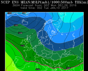 Die Ensemble- Vorhersagekarte des NOAA (USA- Wetterdienst) vom 26.12. für den 10.01.2017 zeigte eine diffuse Hochdruckzone von den Azoren über Mittel- bis nach Osteuropa und tiefen Luftdruck westlich von Island (Quelle: NOAA). Sollte das so eintreten (noch sehr unsicher), so wäre es in Deutschland weder extrem mild, noch extrem kalt: