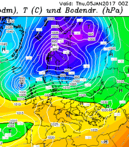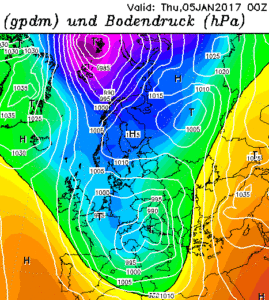 Hiermit nun noch die Bestätigung aus Potsdam: Der Dezember 2016 wies das höchste, seit Aufzeichnungsbeginn 1893 beobachtete Luftdruckmittel mit 1014,78 hPa auf (Barometerhöhe, nicht reduziert). Und was macht unser schwer abschätzbarer Winter 2016/17? Der lief am Neujahrsmorgen zur Hochform durch starke Abkühlung vor Ort auf: Trotz hochreichender Warmluft herrschten in den Tälern und im Thüringer Becken Frühtemperaturen um minus 10 Grad. Die aktuellen Modell- Läufe des GFS bekräftigen die Vermutung, dass dieser Januar zeitweise nasskalt wird. Zwar bleibt wohl im Tiefland durchgehendes Winterwetter aus, es wird aber zumindest phasenweise mal weiss und kalt, aber die Mittelgebirge können sich über reichliche Schneefälle freuen- Ski Heil!