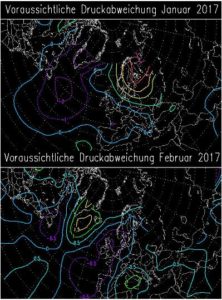 Im Januar 2017 (oberes Bild) nur noch eine leicht geschwächte Westwind- Zirkulation (positive Luftdruck- Anomalien in hpa auf Meeresspiegelniveau, gelbe und rötliche Linien über Nordosteuropa und zu tiefer Luftdruck blau- violett auf dem zentralen Nordatlantik). Das kann zumindest gelegentlich Kälte in Mitteleuropa begünstigen. Im Februar (unteres Bild) soll nun etwas zu tiefer Luftdruck über West- und Nordwesteuropa herrschen. Einem Dezember mit auffallend zu hohem Luftdruck über Mitteleuropa folgten in der Vergangenheit häufiger normale bis milde, als zu kalte Januare. Einzelne, sehr milde oder zu kalte Phasen sind jedoch nicht ausgeschlossen.