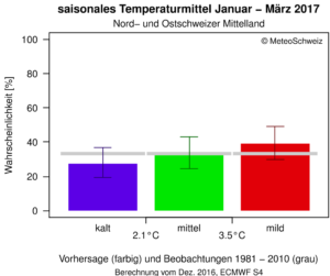 Meteo Schweiz bezieht nun ebenfalls den März ein und erhöht dabei die Wahrscheinlichkeitsaussage für einen milden Winter:
