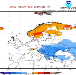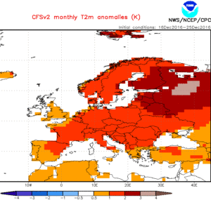 Und das CFSv2- Modell des NOAA (Wetterdienst der USA, folgende 2 Abbildungen, Eingabezeitraum 16. bis 25.12.2016): Januar (oben) eher normal, nur in Teilen des Alpenraumes etwas zu mild und in Südosteuropa zu kalt; Februar (unten) überall viel zu mild. Die vorhergesagten Temperaturabweichungen beziehen sich auf die Mittelwerte der Periode 1981 bis 2010. Die fast täglich aktualisierten, aber leider oft falschen Prognosen unter http://www.cpc.ncep.noaa.gov/products/people/wwang/cfsv2fcst/ (Europe T2m, ganz unten in der Menütabelle; E3 ist der aktuellste Eingabezeitraum):