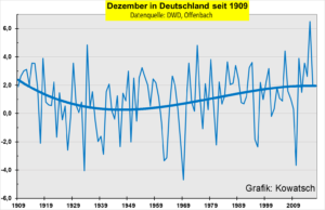 Der Monat Dezember zeigt einen ähnlichen Verlauf wie die anderen Monate. Zu Beginn des letzten Jahrhunderts wurde es zunächst bis über die Jahrhundertmitte hinaus kälter, erst danach wurde der Monat wieder wärmer, und er erreichte 2015 mit 6,5 C seinen Höchststand. Natürlich ist zu beachten, dass wir vor über 100 Jahren ein ganz anderes Deutschland hatten, die Wetterstationen standen noch an ganz anderen Plätzen als heute. Unbeheizte Klöster, Forststationen am Waldrand, Köhlereien im Wald oder Fischteiche vor den Toren der Städte gibt es nicht mehr und die Städte selbst waren kleiner und weniger beheizt als heute. Der Energieverbrauch – eigentlich eine Energieumwandlung in Wärme – war ungleich geringer als heute. Aber für diese gesellschaftlichen Änderungen, die letztlich zu einer schwierigen Vergleichbarkeit geführt haben, ist der Deutsche Wetterdienst nicht verantwortlich. Der DWD sollte bei Presseveröffentlichungen nur stets erwähnen, dass die Temperaturwerte nur mit Vorsicht zu vergleichen sind, und dass es für eine Aussage, dass diese in Grafik 1 dargestellte unbedeutende Dezembererwärmung allein der anthropogenen CO2-Zunahme geschuldet sei, überhaupt keine Beweise gibt. Schließlich wisse man ja nicht wie der tatsächliche Kurvenverlauf wäre, hätte sich Deutschland seit 100 Jahren überhaupt nicht verändert und würden alle Messstationen noch am gleichen kalten Ort stehen.