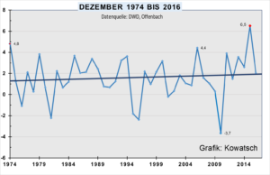 Abb.2: Keinesfalls hat die Erwärmung stärker zugenommen bei den letzten 43 Dezembermonaten seit 1974. Im Gegenteil der Trendlinienanstieg fällt moderat aus, was auch schon aus Grafik 1 ersichtlich ist. Lediglich der „warme Ausreißer“, der Dezember 2015 fällt auf.
