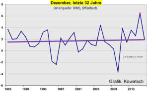 Abb.3: Die Temperaturen in den letzten 32 Dezembermonaten sind nahezu gleich geblieben. Die Trendlinie zeigt einen unbedeutenden nicht signifikanten Dezemberanstieg.