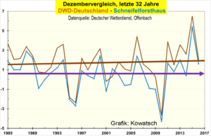 Abb.4: Die braun gezeichneten Deutschlandtemperaturen liegen etwas höher als die blauviolette Trendlinie der ländlichen Station Schneifelforsthaus. Die Temperaturunterschiede jedoch blieben in den letzten 32 Jahren fast gleich. Das zeigen die Trendlinien. Die DWD-Stationen haben einen nicht signifikanten Erwärmungstrend und Schneifelforsthaus blieb unverändert, so dass sich die beiden Enden der Trendlinien nur unmerklich öffnen.