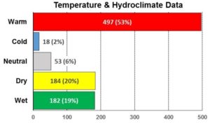 Ein erster oberflächlicher Blick auf Abbildung 1 zeigt, dass es eine große Anzahl von warm study locations gibt, die über die ganze Welt verteilt sind. Um jedoch die globale Anzahl der Warm-Kalt-Neutral-Trocken-Nass-Studien zu bestimmen, habe ich die kartierten Daten der 934 Studien heruntergeladen, die am 30. Dezember 2016 verfügbar waren, und habe diese in Abbildung 2 zusammengefasst: