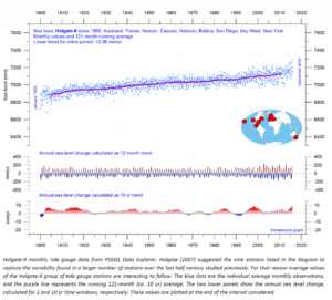 Eine spürbare Beschleunigung des Meeresspiegelanstiegs ist in den Daten nicht zu erkennen, wenn man von den kurzmaßstäblichen Zyklen einmal absieht. Zum gleichen Ergebnis kommen auch Auswertungen von Albert Parker und Jan Kjetil Andersen. Eine Studie von Ocana et al. 2016 hält es zudem für möglich, dass natürliche interne Klimavariabilität als extern gesteuerter Klimatrend fehlgedeutet wurde.